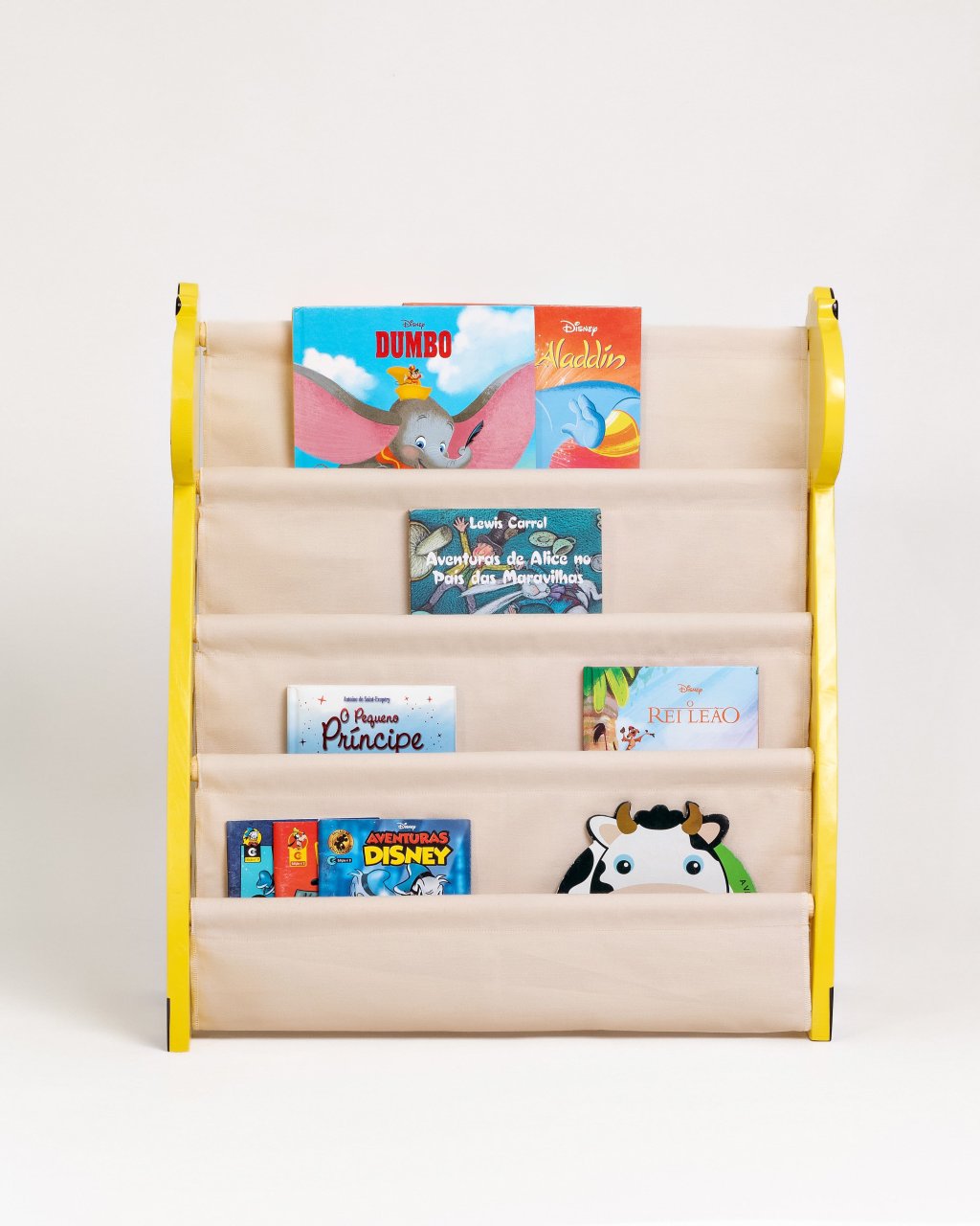 Projetado para que as crianças tenham fácil acesso aos seus livrinhos favoritos, ele é feito de madeira resistente e sem nós, conta com bolsos em lona de tecido, proporcionando um armazenamento seguro e prático.