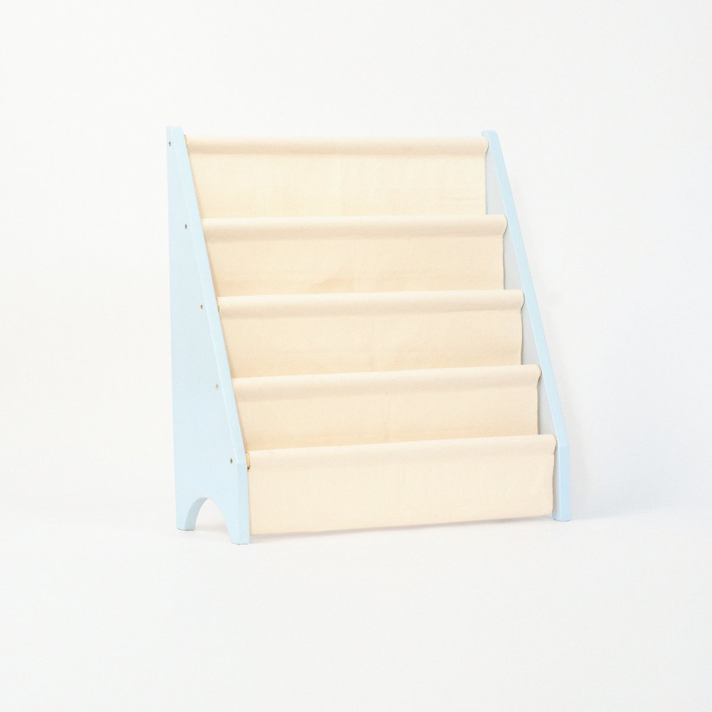 Rack Para Livros, bookshelf finalizado em tom de azul céu, com 4 bolsos lona algodão premium +