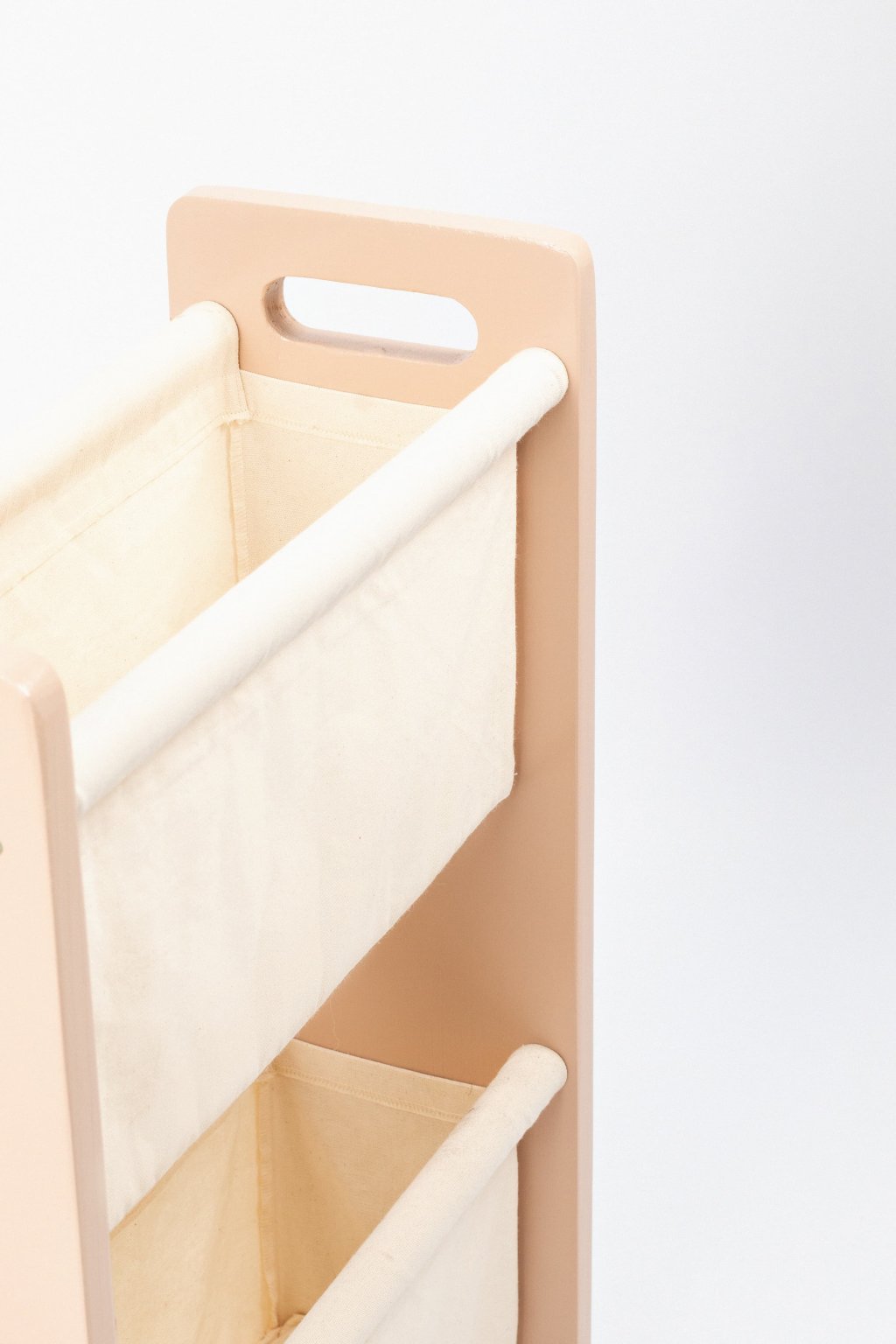 Rack organizador de bolsos, bookshelf finalizado em tom de areia fofa, com 2 bolsos lona algodão premium +