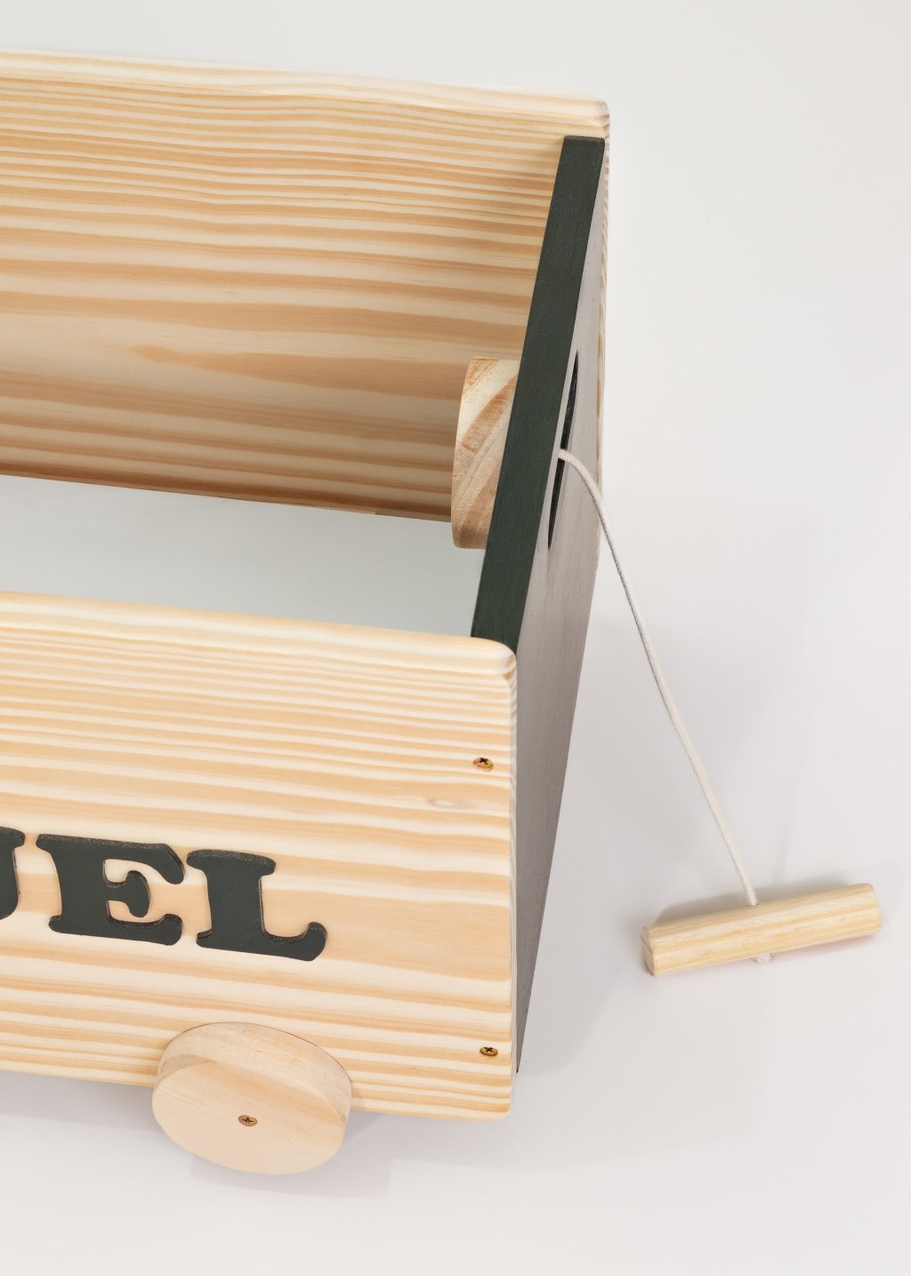 Equipado com rodinhas, rodizios, e puxador de corda com alça de madeira permite que a criança leve seus brinquedos de um canto a outro sem esforço