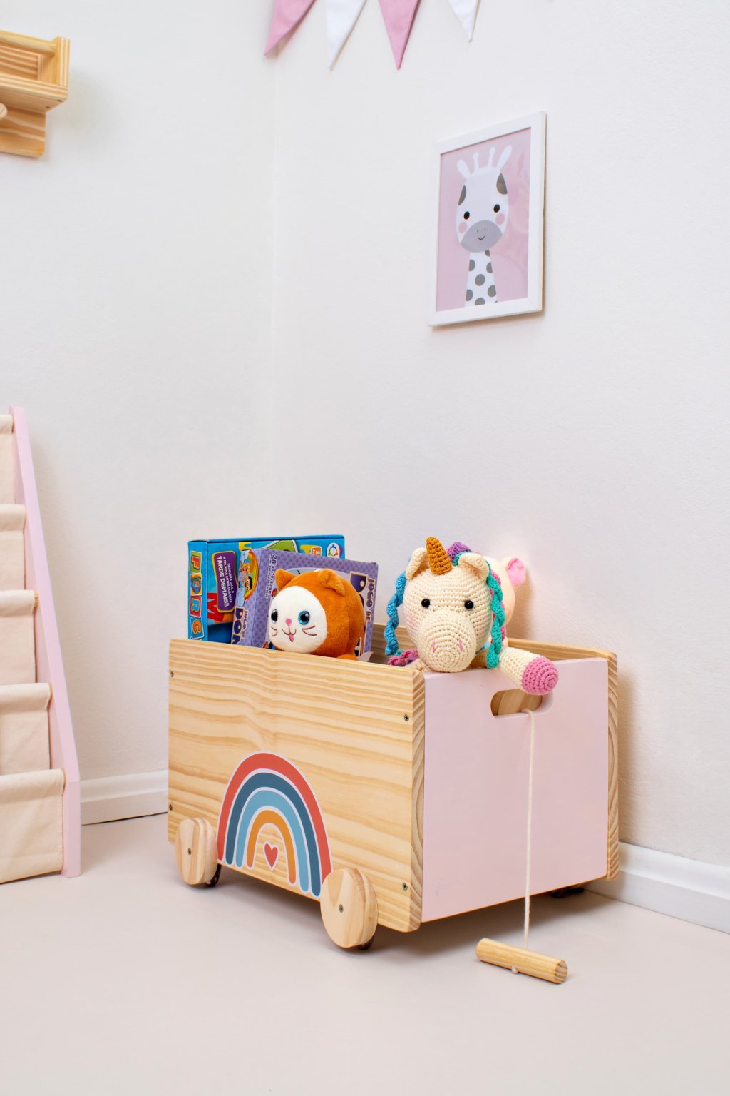 Caixa de Brinquedos com Rodinhas e Puxador Arco-íris rosa