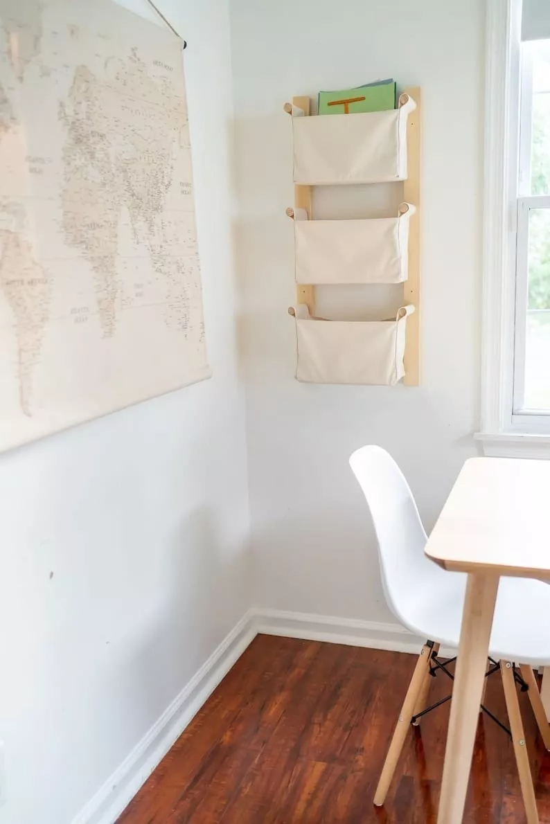 Pode ser instalado em qualquer superficie vertical, e os bolsos são removiveis da estrutura de madeira.