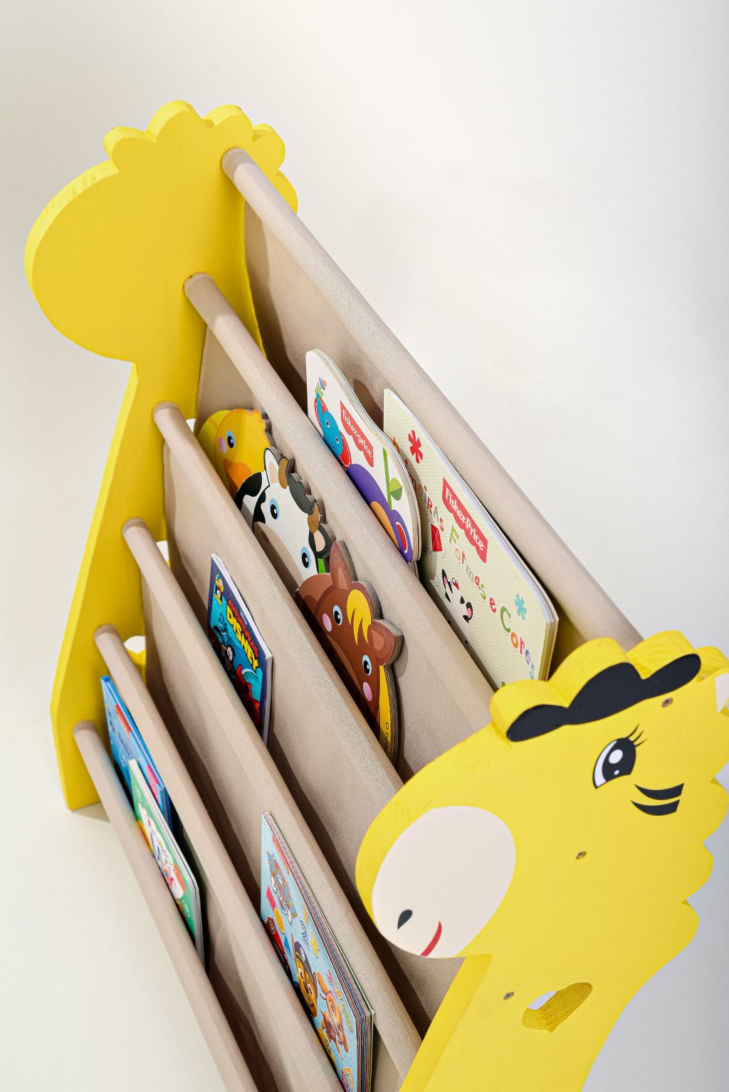 Projetado para que as crianças tenham fácil acesso aos seus livrinhos favoritos, ele é feito de madeira resistente e sem nós,finalizado com tinta esmalte amarela, conta com bolsos em lona de tecido, proporcionando um armazenamento seguro e prático.