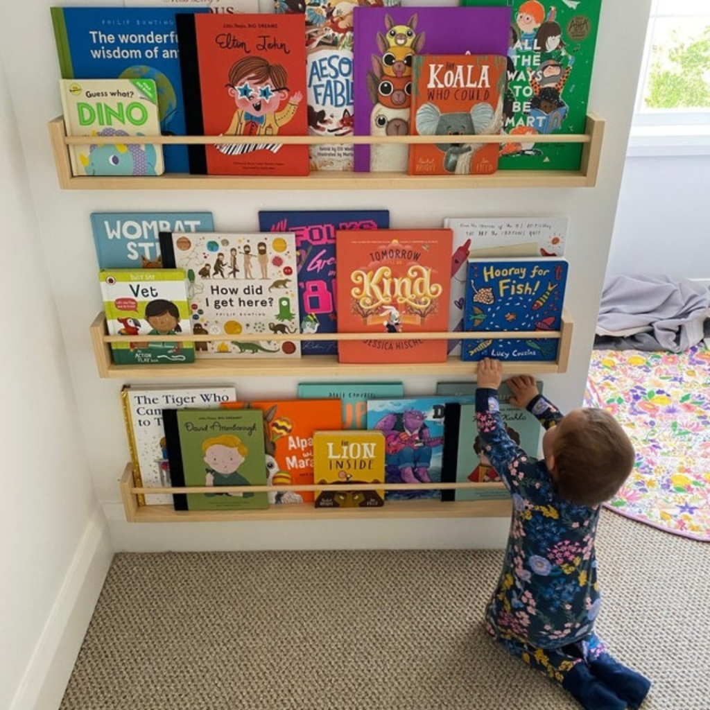 Ideal para criar um ambiente lúdico criativo organizado e estimulante, estes prateleiras ficam lindas na parede, as capas dos livros amostra ajudam a estimular os pequenos a pegarem o gosto pela leitura.