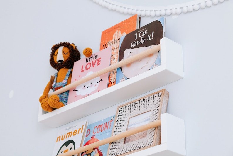 Ideal para criar um ambiente lúdico criativo organizado e estimulante, estes prateleiras ficam lindas na parede, as capas dos livros amostra ajudam a estimular os pequenos a pegarem o gosto pela leitura.
