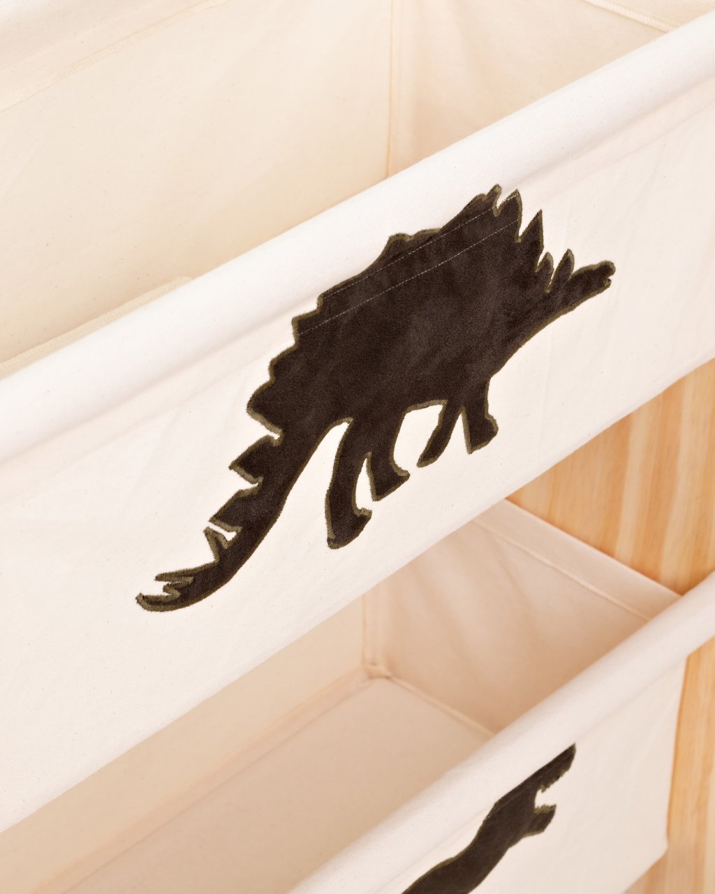 Rack Organizador pocket 2 Bolsos largo bege natural crú temático de dinossauros, e estrutura de madeira selecionada sem nó.