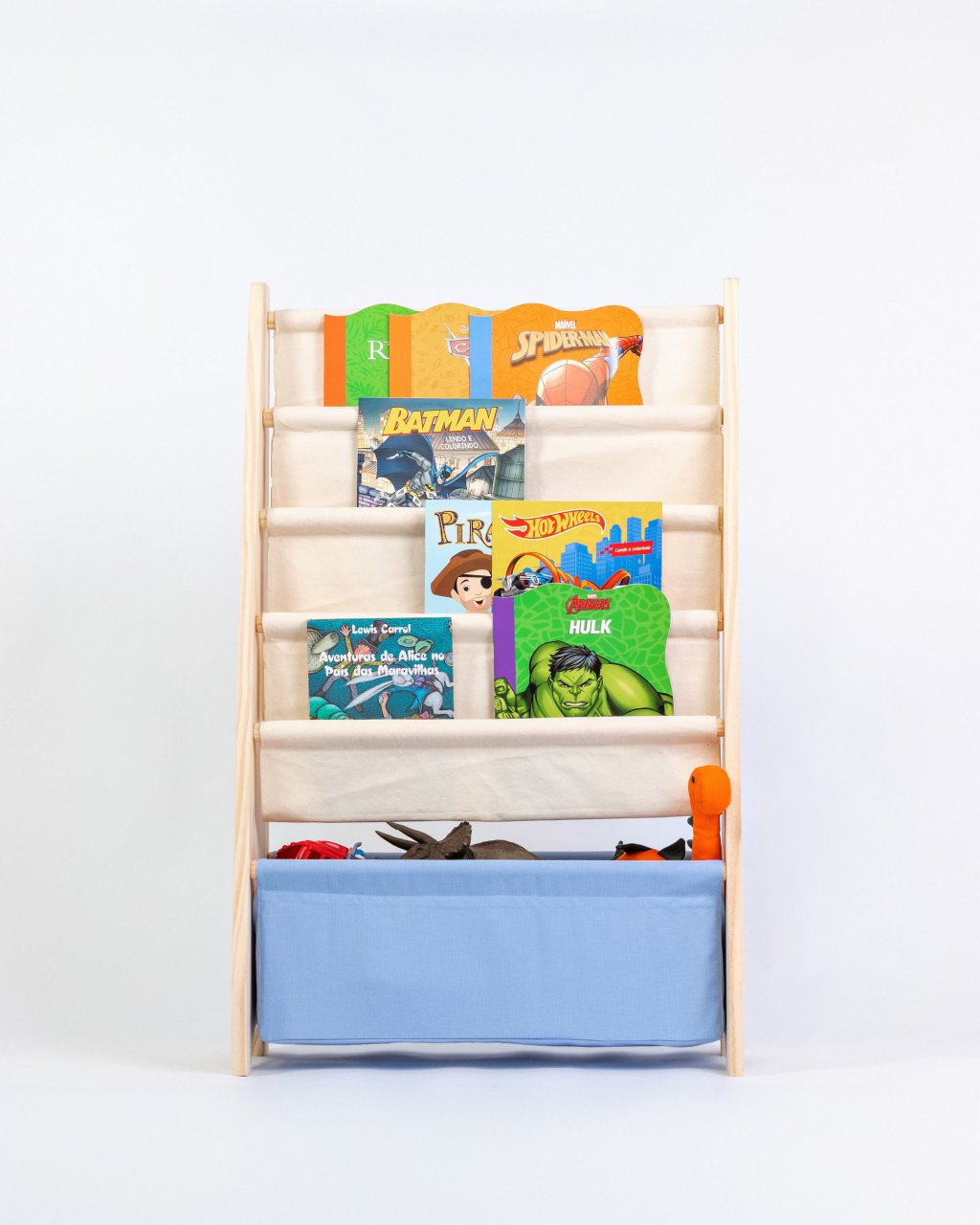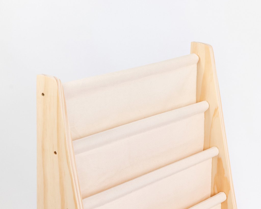 Rack para Livros e Brinquedos Canguru Montessori – Madeira Selecionada e Lona de Algodão Premium
