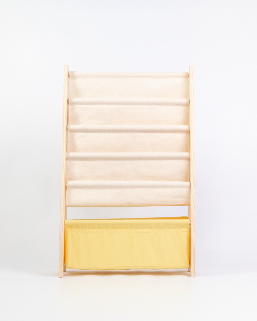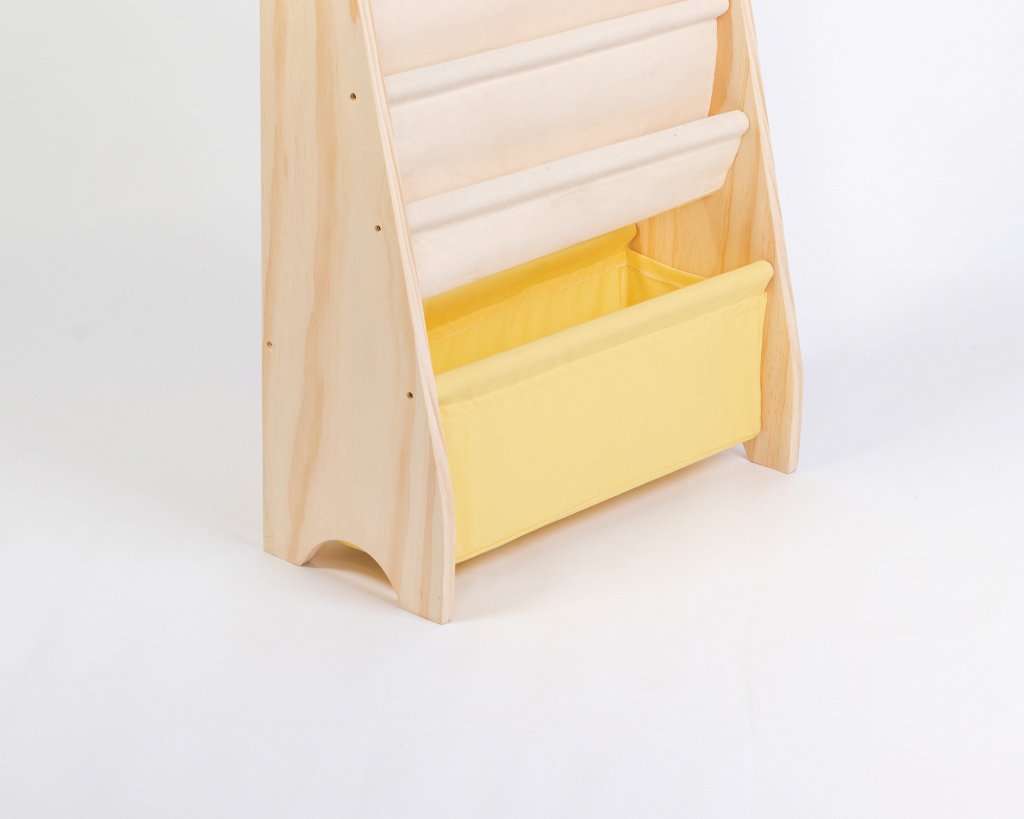 Rack para Livros e Brinquedos Canguru Montessori – Madeira Selecionada e Lona de Algodão Premium