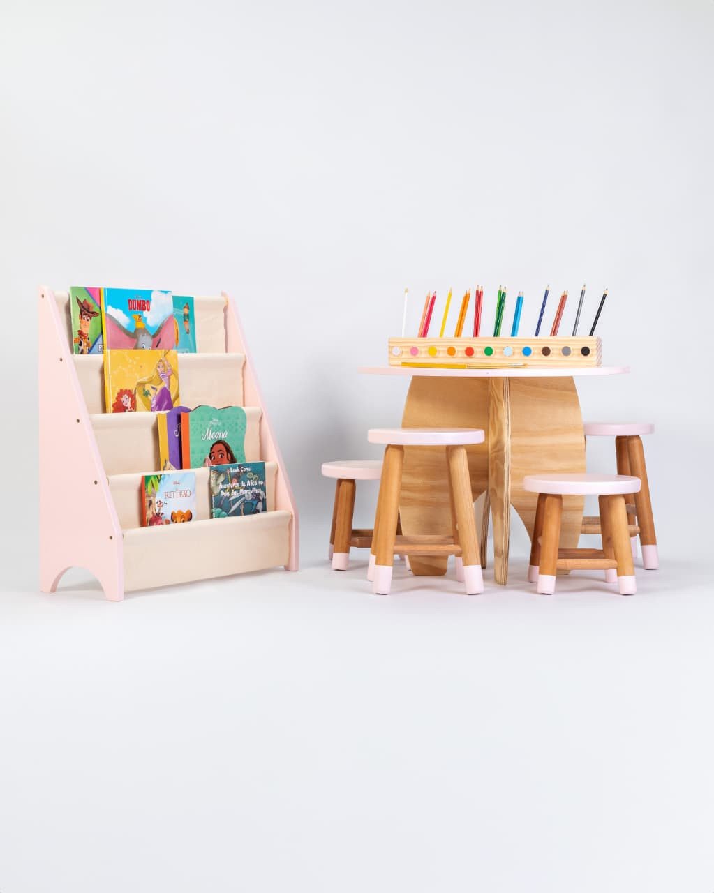 Kit Completo Montessori – Mesa de Atividades + 4 Banquinhos + Porta-Lápis + Rack Porta Livros + Caixa de Brinquedos – Rosa Suave