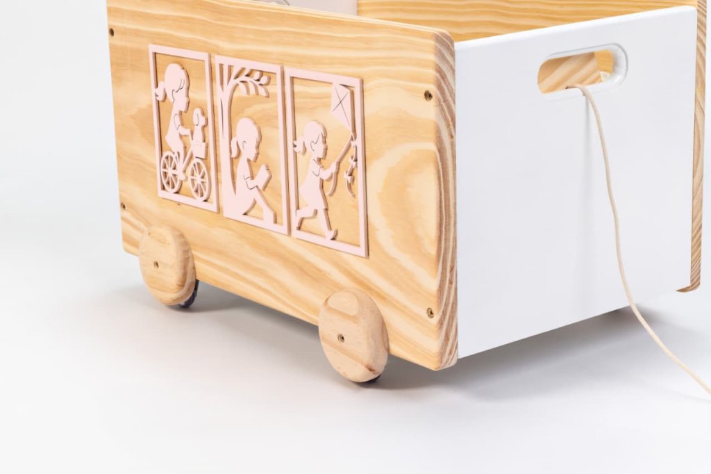 Fabricada em madeira selecionada e parcialmente pintada em branco e rosa claro, a caixa harmoniza perfeitamente com o rack. Conta com alças vazadas para fácil manuseio, rodinhas de madeira decorativas e rodízios funcionais para movimentação suave. Possui ainda um puxador de corda com pegador anatômico para maior conforto.